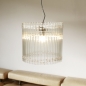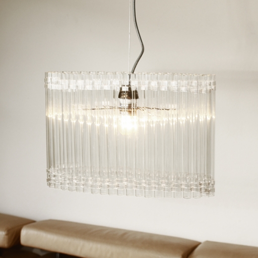 Die Hängeleuchte besteht aus 42 Glas-Tubes, Länge 30 cm und 96 transparenten Clips. Die Form des Leuchtenschirms läßt sich durch einfaches Verdrehen und Verschieben der Glas-Tubes frei gestalten. Sie haben mit diesem TERRIFIC TUBES Produkt die Möglichkeit unterschiedliche Lampenschirmformen zu "modellieren". Die abgebildete Variante ist ein Beispiel.