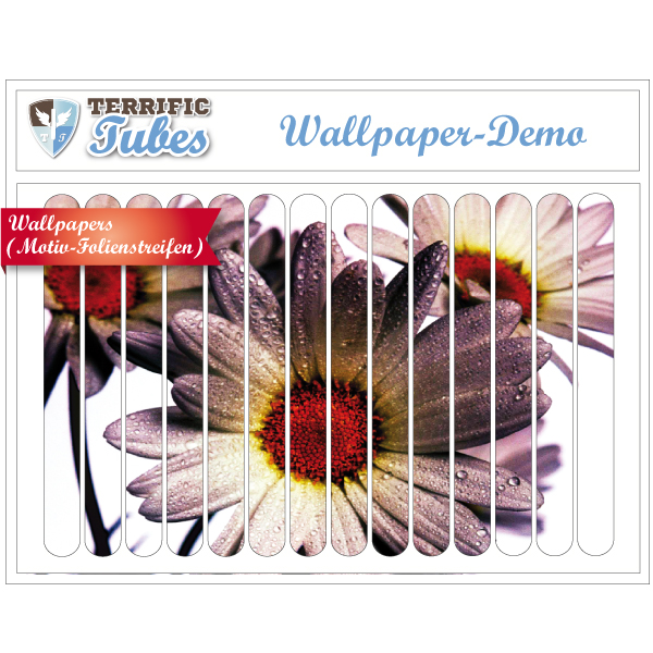 The wallpaper foils are delivered optional pre-cutted (plotted) or completely cutted and inserted ito the Glass-Tubes "Ready-to-hang". The pre-cutted wallpaper foils you just pull out of the surrounding material and insert them into the Glass-Tubes.