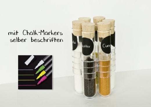 Spice-Gun is a handy Desiger spice carousel for self labeling. 6 tubes made of high-quality laboratory glass keep your personal spice favorites fresh and ready for your mission in terms of barbecue or haute cuisine. The reusable spice labels can be designed with chalk or chalk markers according to your personal taste and topping the reduced functional product design. Spice-Gun can be cleaned by hand and easily and quickly refill and use through the large opening.